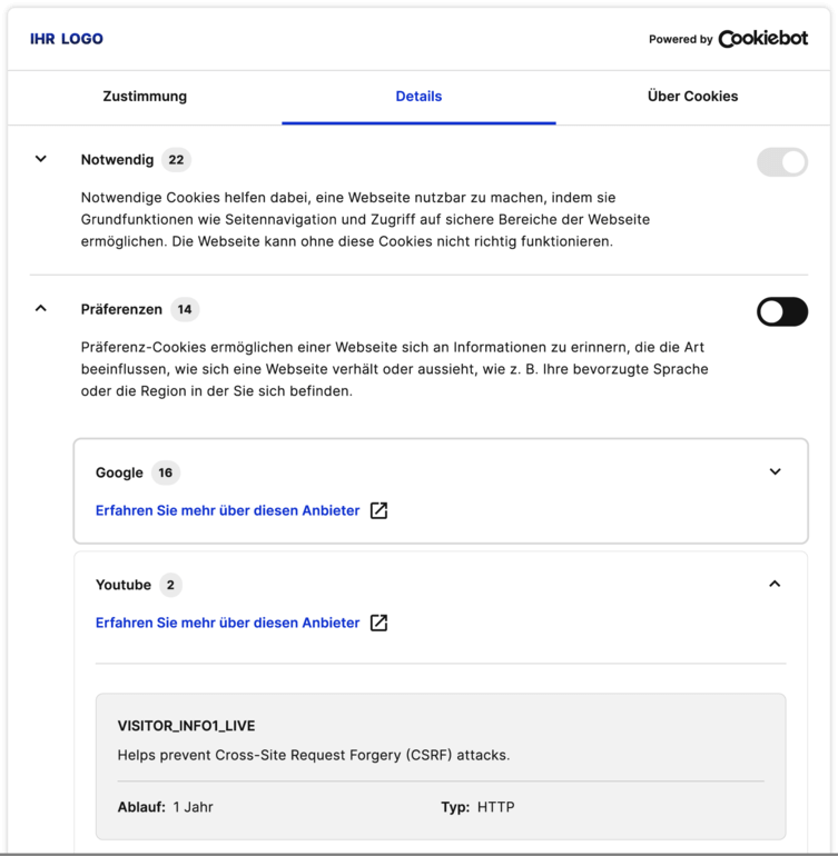 Ihre Nutzer können die verschiedenen Cookie-Kategorien direkt im Banner aktivieren und deaktivieren. Detaillierte Informationen über alle Cookies werden direkt im Banner angezeigt (durch Maximieren der jeweiligen Kategorie).