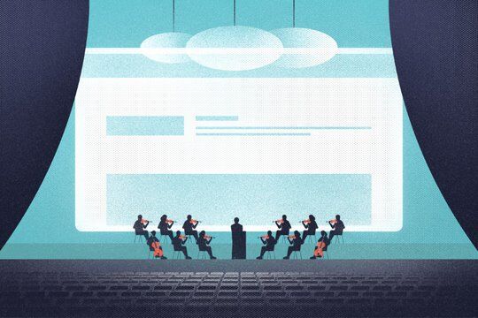In diesem Bild stellt die Cookiebot CMP die Noten auf den Seiten des Dirigenten dar, mit denen er das Orchester leitet. Diese Noten sagen ihm, welche Musiker spielen dürfen und unter welchen Umständen sie nicht spielen dürfen.