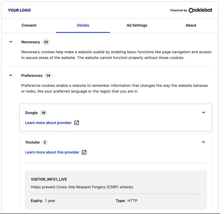 Achieving CCPA compliance may sound complex, but it doesn’t have to be. Cookiebot CMP is a CCPA compliance solution. Our tool can help you by automatically scanning your website to identify all cookies and tracking technologies in use. This list can then populate your consent banner and cookie notice. Present your website visitors with an accurate cookie banner with comprehensive information, which helps you comply with the CCPA, among other global privacy laws.