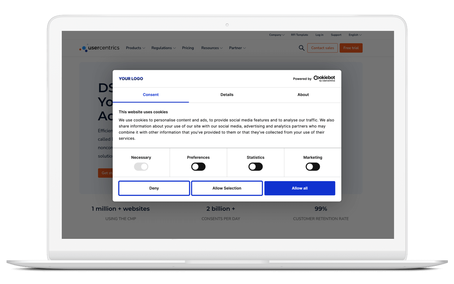 Usa Cookiebot CMP para conseguir el consentimiento de tus usuarios y logra el equilibrio perfecto entre el uso de cookies en tu sitio web y una política de cookies acorde a la ley.