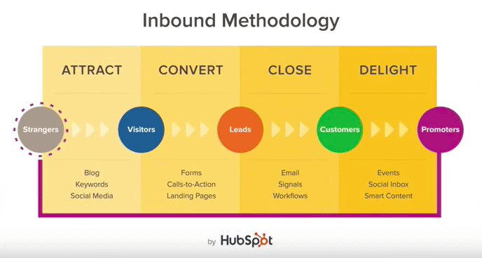 Como muestra el pantallazo siguiente, HubSpot le ayuda a encargarse de todos los pasos del camino, desde convertir a un extraño en un visitante, de ahí en un cliente potencial, a un comprador y a éste en un promotor.