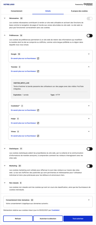 - Une déclaration cookies complète sur le fournisseur, l'objet, la durée et le type de chaque cookie