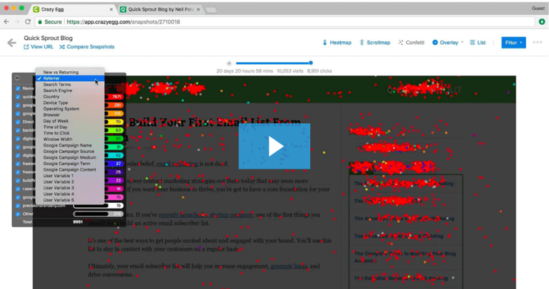 Comme pour Clicky, les cartes thermiques de Crazy Egg visualisent le trafic des utilisateurs sur votre site, en montrant où les utilisateurs cliquent, font défiler et plus encore pour vous donner une image détaillée des forces gravitationnelles des éléments de votre domaine.