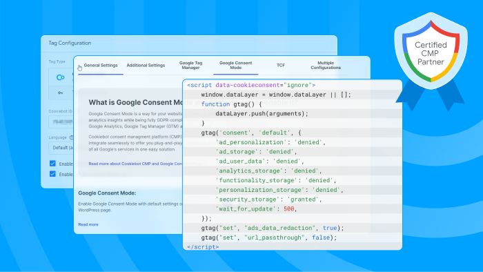 In order to enable Google consent mode v2 on your website, you need to have a cookie banner solution in place. If you already have a Cookiebot CMP subscription, the Cookiebot script will automatically send the appropriate signals to Google on consent submission. You will manually need to ensure that a default state is set though.